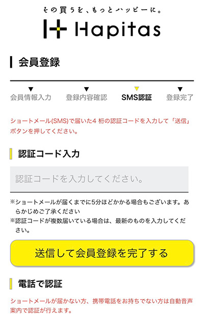 7.次の画面で登録した携帯番号へ認証コードが送られます。